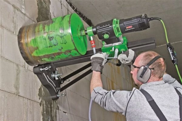 Carotteuse diamantée professionnelle à 3 vitesses, avec boîtier entièrement en aluminium et boîte de vitesses lubrifiée à l’huile. Surcapacité généreusement dimensionnée pour le forage humide dans le béton.